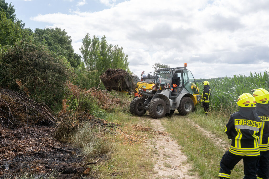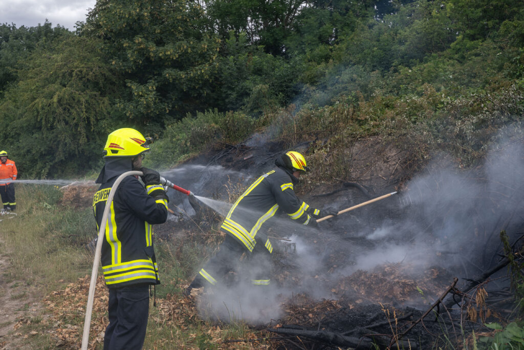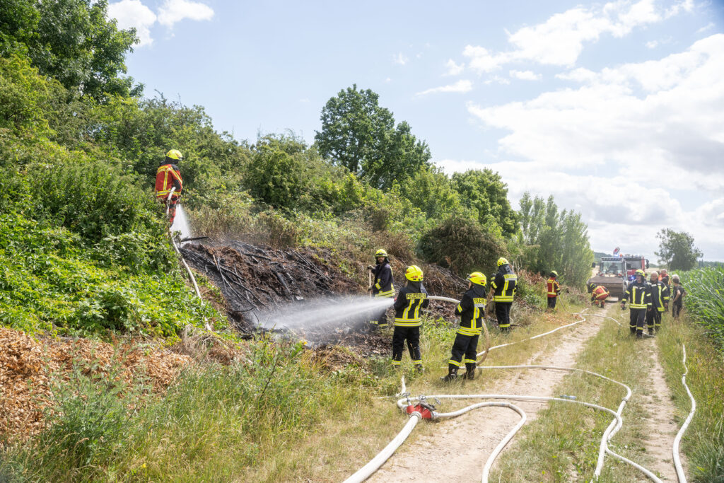 Zur Brandbekämpfung wurden insgesamt vier Strahlrohre eingesetzt. Ziel war die zügige Brandbekämpfung sowie die Verhinderung einer Ausbreitung auf umliegende Grünflächen. Für die effektive Brandbekämpfung wurde das Brandgut mit Mistgabeln auseinandergezogen. Als diese Mittel nicht mehr ausreichten, wurde ein Radlader des Bauhofs zur Einsatzstelle beordert, der das Wenden und Auseinanderziehen übernahm.